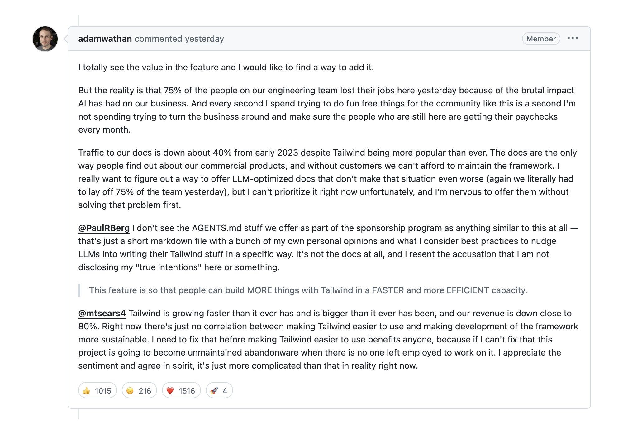 Given the widespread adoption of Tailwind CSS industry wide, there was an outpouring of support for the beleaguered founder, Adam Wathan, who admitted the depressing nose dive the company was in across his podcast on X and while closing Github Issues from community members who wanted to make it even easier to never visit the Tailwind CSS documentation site (& be upsold on their premium components).